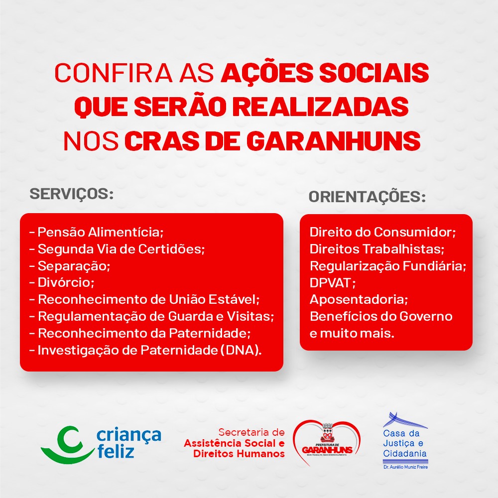 A Secretaria de Assistência Social e Direitos Humanos (SASDH), por meio do Programa Criança Feliz e da Casa de Justiça e Cidadania, realiza entre 14 e 30 de novembro uma série de ações sociais em alguns Cras de Garanhuns. Serviços relacionados à pensão alimentícia, segunda via de certidões, reconhecimento de união estável e orientações em diversas áreas do direito, serão alguns dos serviços ofertados. As ações acontecem sempre a partir das 9h.