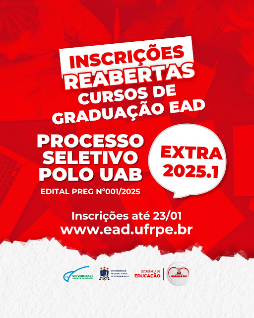 Os interessados em ingressar nos cursos de graduação do Polo UAB Garanhuns têm uma nova oportunidade. As inscrições para o Edital 01/2025 foram reabertas e podem ser realizadas até esta quinta-feira, 23 de janeiro. Em Garanhuns, estão disponíveis vagas para os cursos de Artes Visuais, Física, História e Letras. A seleção é parte do Processo Seletivo Extra 2025.1, realizado em parceria entre a Prefeitura de Garanhuns e a Universidade Federal Rural de Pernambuco (UFRPE).